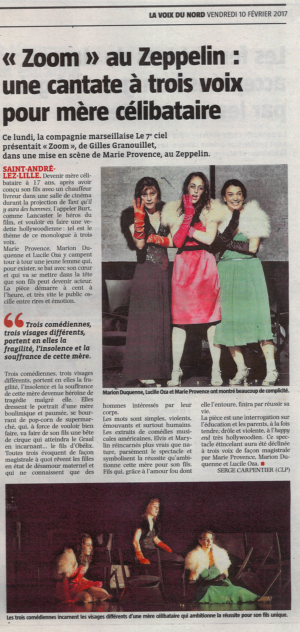"La pièce démarre à cent à l’heure, et très vite le public oscille entre rires et émotion. Trois comédiennes, trois visages différents, portent en elles la fragilité, l’insolence et la souffrance de cette mère devenue héroïne de tragédie malgré elle." La voix du Nord